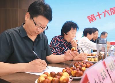 在第十六届沾化冬枣枣王争霸赛上,评委正给冬枣打分。