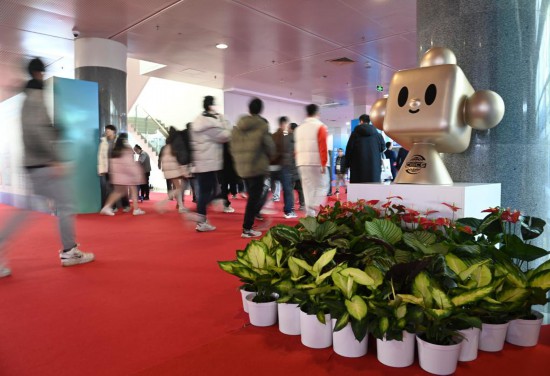 11月29日,链博会展厅入口处摆放着带有“链氪”形象的小花坛引导观展人群。
