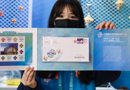 11月29日,一名观展者在自己购买的链博会纪念邮封上加盖了带有“链氪”形象的纪念邮戳。