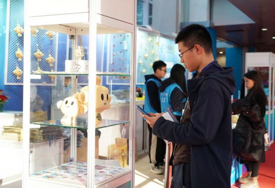11月29日,一名在链博会文创小店服务的志愿者向记者展示带有“链氪”形象的链博会专属纪念邮折。